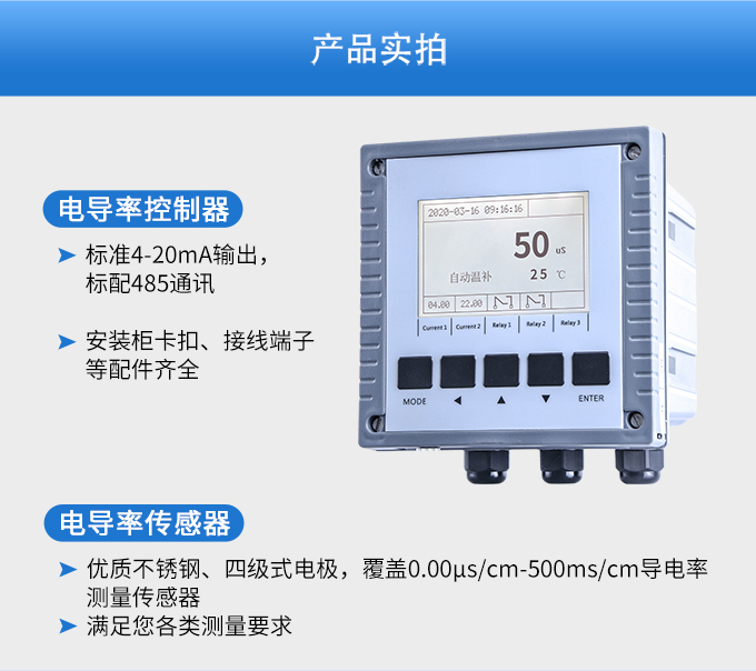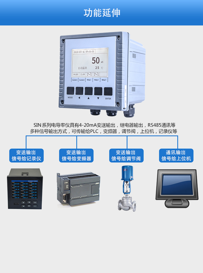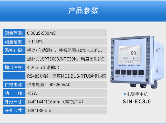 SIN-EC8.0工業(yè)電導(dǎo)率儀表,大屏顯示,可對各種工業(yè)用水的電導(dǎo)率(TDS)值進(jìn)行連續(xù)測量和控制。根據(jù)水工業(yè)的環(huán)境和特點(diǎn)結(jié)合國際供電標(biāo)準(zhǔn),考慮了特殊環(huán)境的電氣設(shè)計(jì)規(guī)范,增加了220VAC供電。