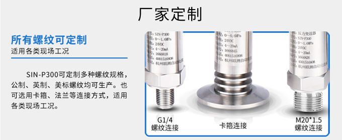 SIN-P300通用型壓力變送器德國進口硅芯片,精度高性能穩(wěn)定;SIN-P300型通用型壓力變送器采用擴散硅壓力芯體作為敏感元件,內(nèi)置處理電路將傳感器毫伏信號轉(zhuǎn)換成標準電壓﹑電流信號輸出,可直接與計算機、控制儀表﹑顯示儀表等相連。